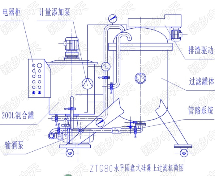 8、本機所選用的硅藻土添加泵為隔膜式計量泵,其采用國外技術生產,結構簡單,計量精確,且可根據待濾液的渾濁程度,隨時調節硅藻土等助濾劑的添加量。